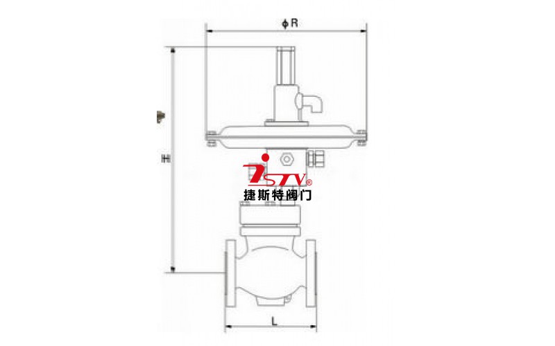 該閥采用大膜片執(zhí)行機構(gòu)輸出力大穩(wěn)定,對壓力流量微小變化極其敏感,控制精度很高,閥芯采用單座流開(高進低出)設(shè)計,在閥蓋處(和閥體連接處)安裝有平衡膜片(起到閥前壓力平衡,消除不平衡力)閥后壓力經(jīng)取壓管進入薄膜執(zhí)行機構(gòu),同薄膜執(zhí)行機構(gòu)調(diào)節(jié)彈簧相比較,壓力達(dá)不到設(shè)定值(調(diào)節(jié)壓縮執(zhí)行機構(gòu)彈簧)閥后壓力則變大,反之則變小。